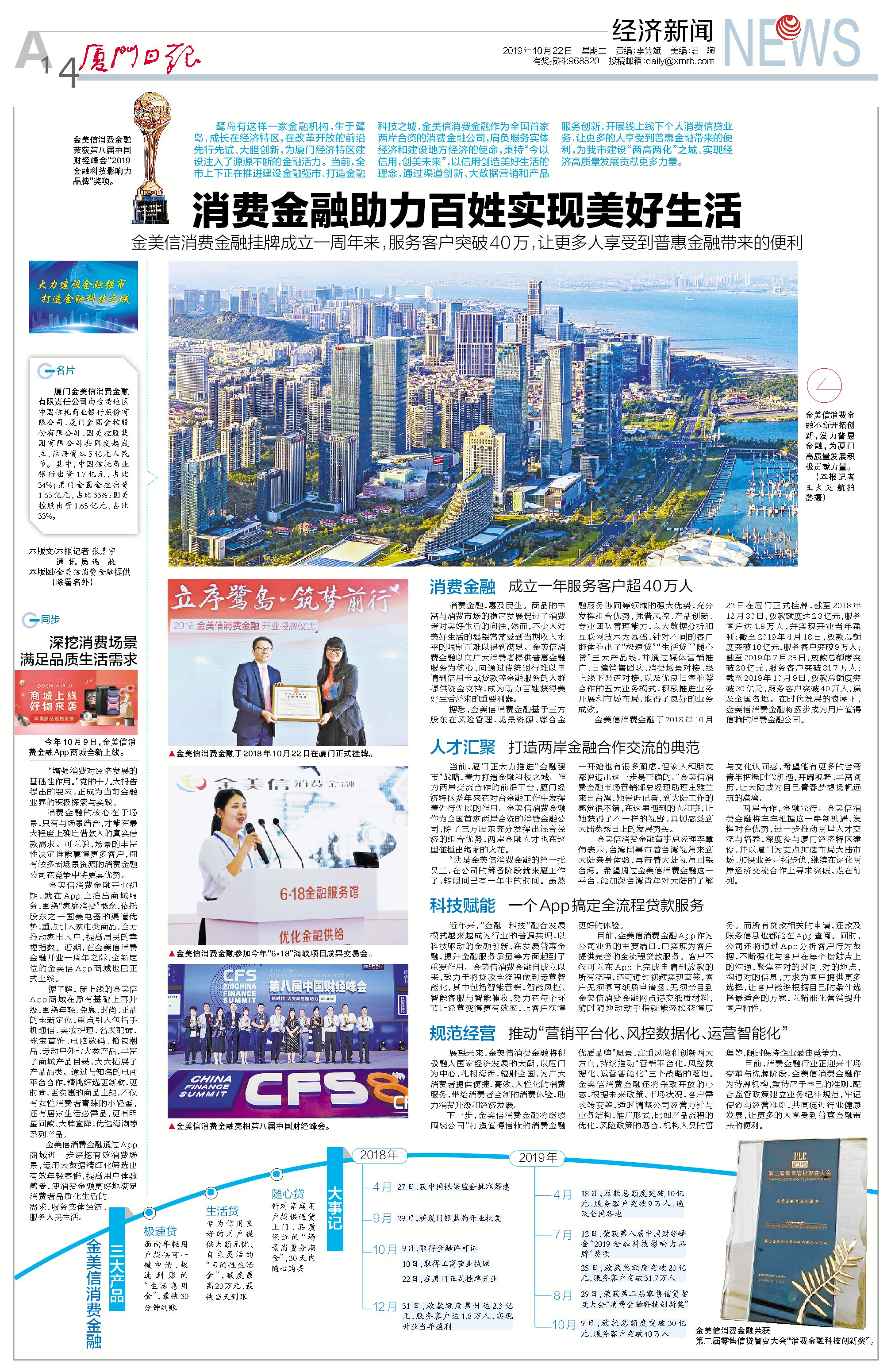 鹭岛有这样一家金融机构,生于鹭岛,成长在经济特区,在改革开放的前沿先行先试、大胆创新,为厦门经济特区建设注入了源源不断的金融活力。当前,全市上下正在推进建设金融强市、打造金融科技之城,金美信消费金融作为全国首家两岸合资的消费金融公司,肩负服务实体经济和建设地方经济的使命,秉持“今以信用,创美未来”,以信用创造美好生活的理念,通过渠道创新、大数据营销和产品服务创新,开展线上线下个人消费信贷业务,让更多的人享受到普惠金融带来的便利,为我市建设“两高两化”之城、实现经济高质量发展贡献更多力量。